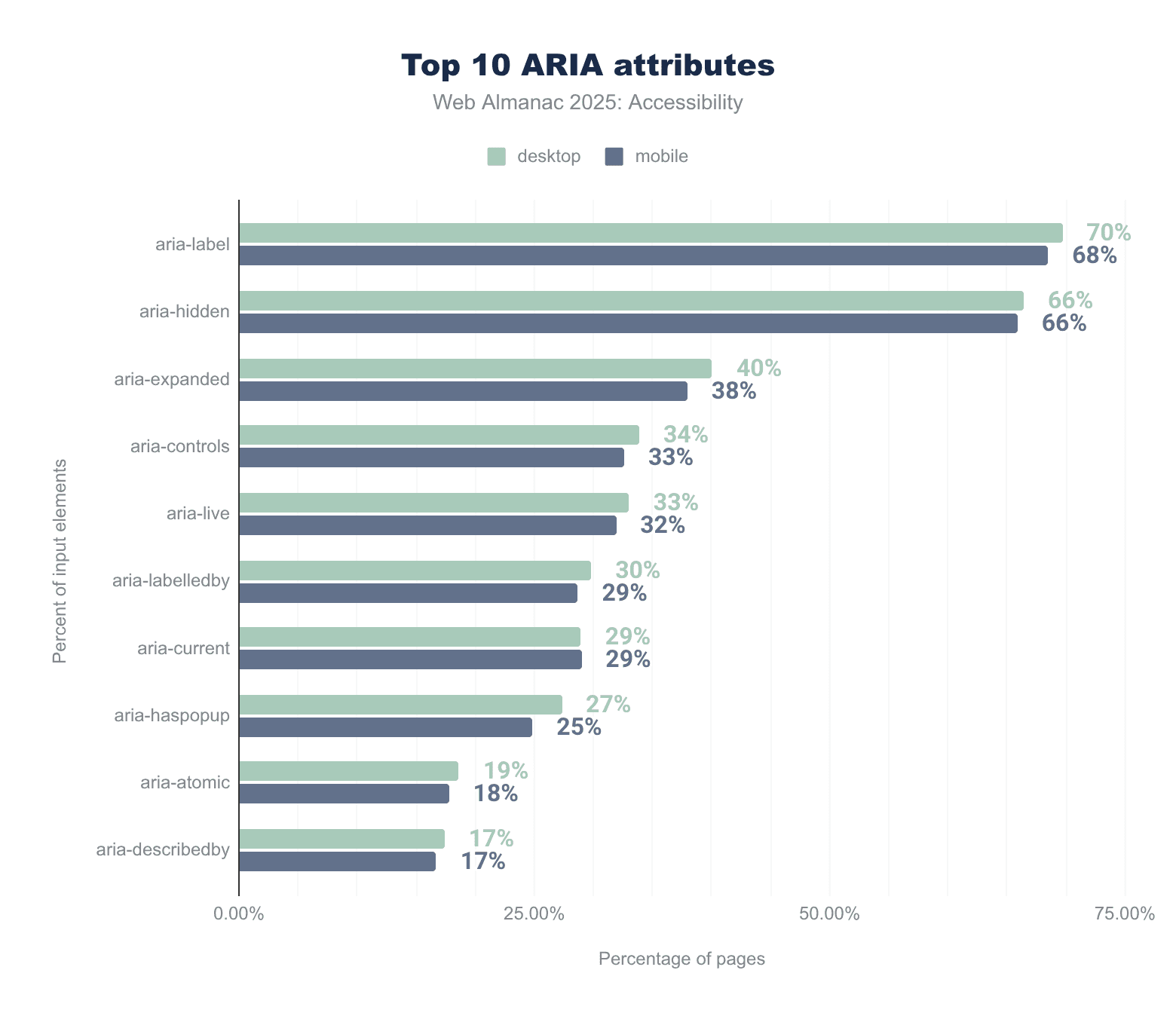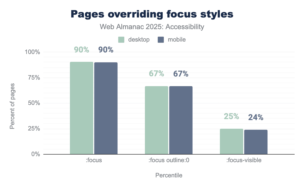 :focus selector is present on about 90% of both desktop and mobile pages, while removing focus outlines with :focus { outline: 0; } appears on roughly two-thirds of pages (67%) for both. Usage of the more accessible :focus-visible selector is much lower, at about one-quarter of pages (25% on desktop and 24% on mobile).In 2025, 67% of sites explicitly removed default focus outlines, up 14% from 2024. This concerning trend may impair accessibility if not replaced with effective styles. On the positive side, adoption of the :focus-visible pseudo-class has grown. This means developers are starting to create context-aware focus indicators that are visible only when necessary.