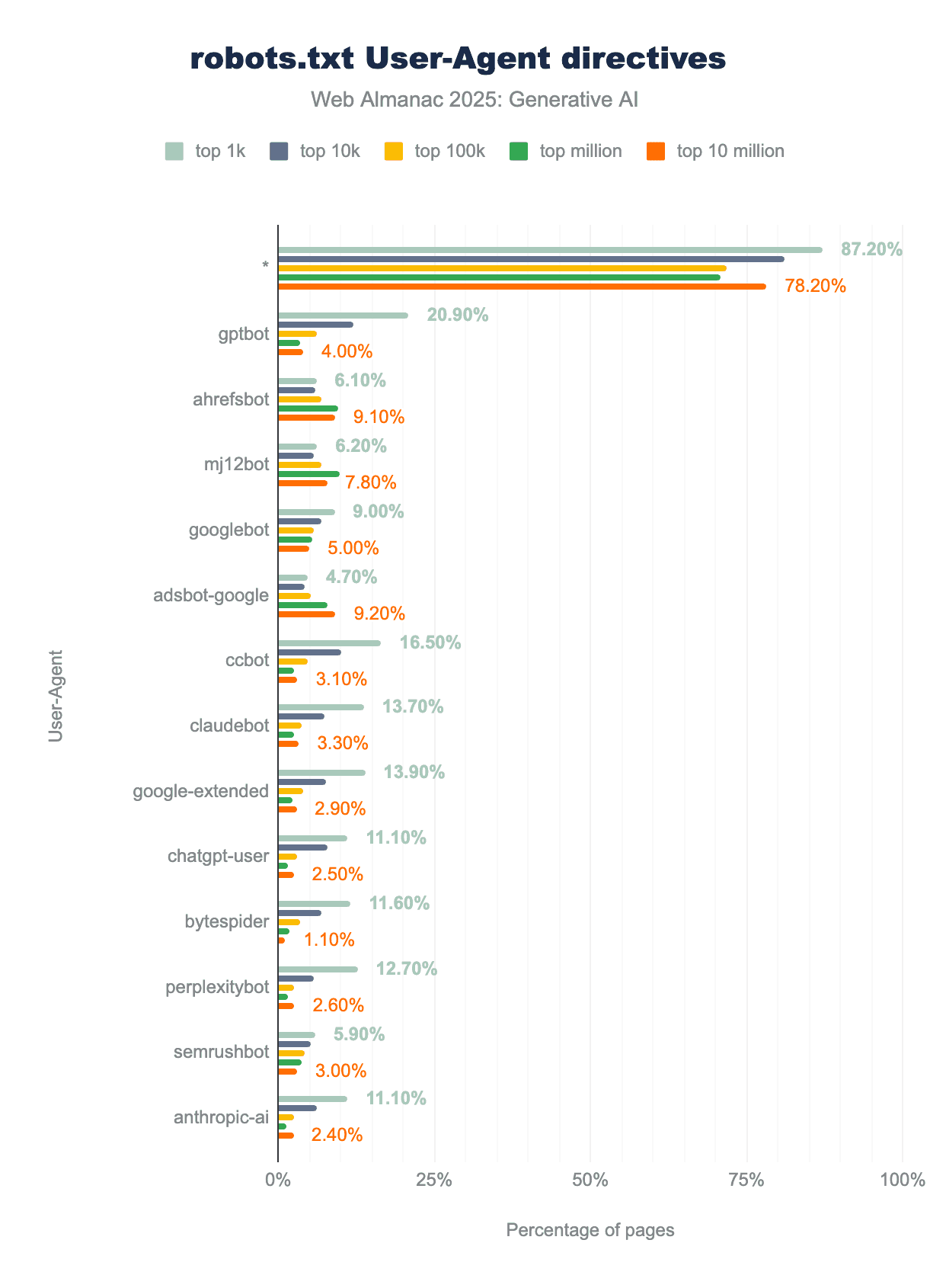 The figure above shows the top directives observed across all websites, grouped by their rank. The wildcard directive * is the most commonly used one, present in 97.4% of robots.txt files. It allows site authors to set global rules for all bots. The second most used user agent is gptbot (note, our analysis lower-cased the user-agent names), which saw adoption rise from 2.6% in 2024 to around 4.5% in 2025.
