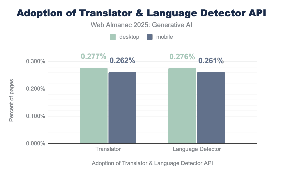 They have achieved the widest adoption of the Built-in AI APIs. The July 2025 HTTP Archive crawl detected the Translator API on 0.277% of all desktop sites and 0.262% of all mobile sites, with the Language Detector API used on just 0.001% fewer sites.