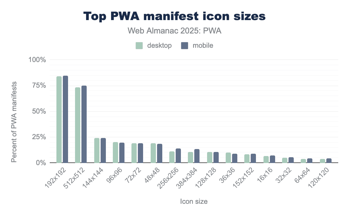 pushManagerregistrations has dropped since 2022, likely due to the rise of usage (see note below) of service worker to focus on performance rather than pushing notifications. - Between 2022 and 2025 the total of PWA technology usage (desktop 12.5 million and mobile 15.5 million) has around doubled (desktop 5.4 million and mobile 7.9 million - 2022). The percentage of usage for service workers has surged around 10 times, and manifests have largely stayed around the same 8-9% usage.