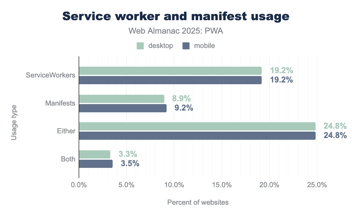 We’ve seen the latest data on what the most used service worker and manifest features are. In 2025, we can see that roughly one fifth of sites use service workers, and roughly one tenth use manifests.