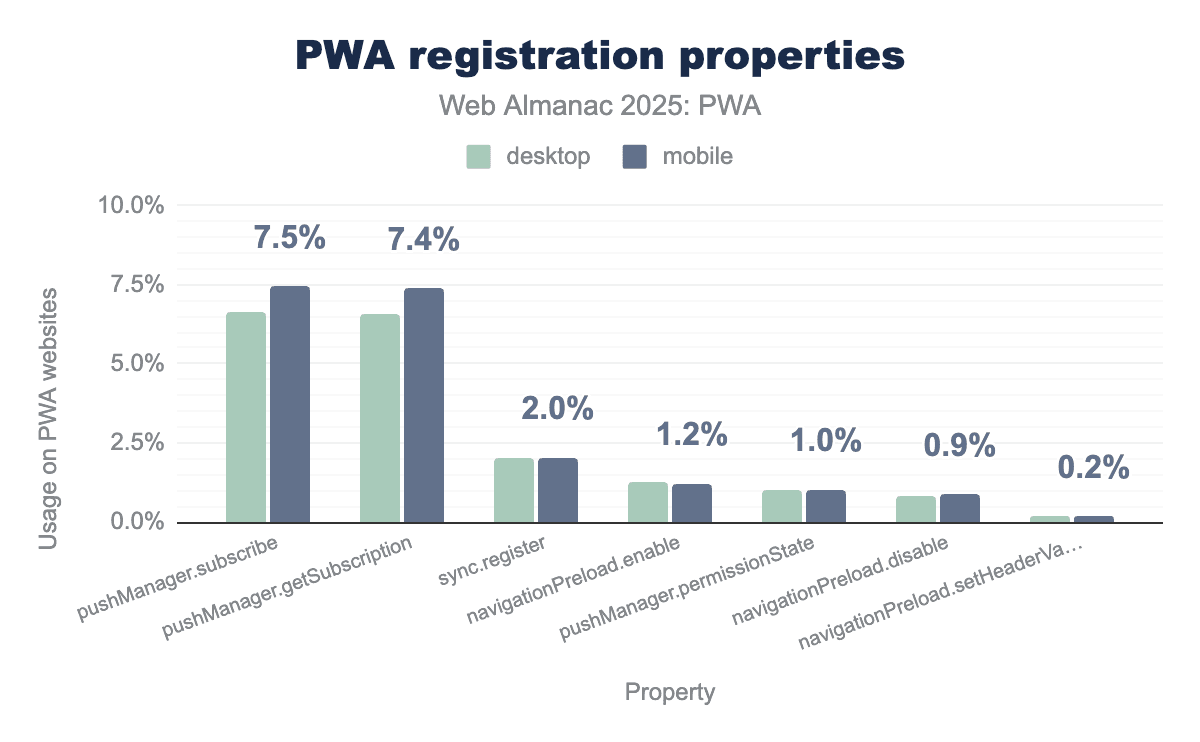 pushManager.subscribe and pushManager.getSubscription are the most utilized properties, each appearing on approximately 7% of PWA websites across both platforms. In contrast, advanced synchronization and performance properties like sync.register and navigationPreload.enable see much lower implementation, with usage rates hovering between 1% and 2%. Overall, the visualization demonstrates that push notification capabilities are significantly more common in the PWA ecosystem than background sync or navigation preloading features.Diving deeper into service worker functionality, the data sheds some light into advanced capabilities that PWAs are using. For all PWAs using service workers across desktop and mobile, ~7% are registering for pushManager, 2% register for sync and 2% register for navigationPreload.