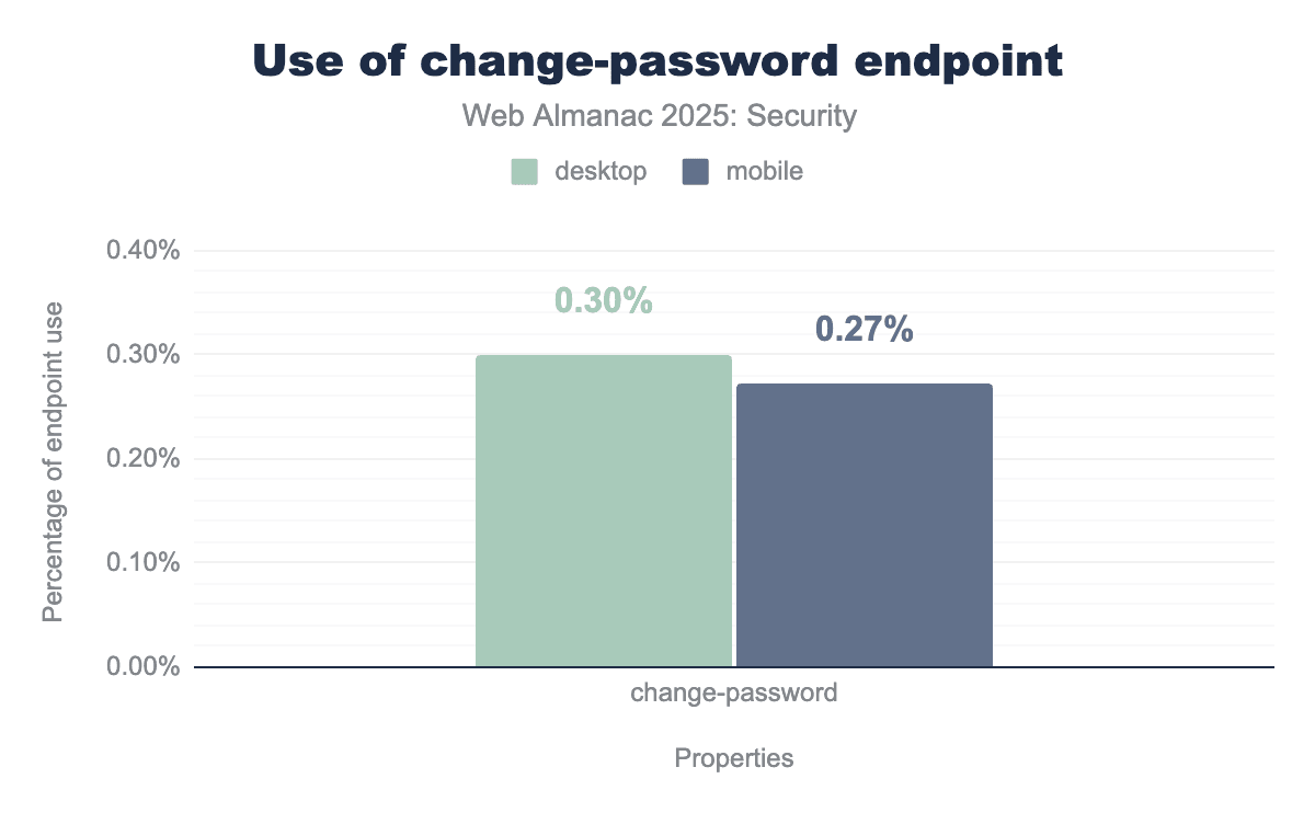 We see a very minor rise to 0.30% in desktop sites (up from 0.27%) and no change for the mobile endpoints, which remain at 0.27%. This slow adoption is not unexpected, especially taking into account that not all websites require authentication mechanisms.
