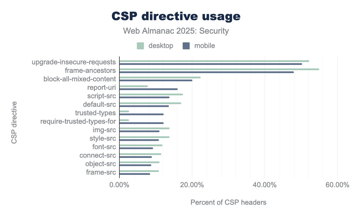 Trusted types can be used to restrict the parameters passed into injection sinks (like element.innerHTML) such that they only allow properly typed values to be passed instead of plain strings. By restricting the values passed to injection sinks, many possible DOM XSS vulnerabilities can be prevented. The trusted types header we observe appears on more than 12% of the mobile pages. We don’t have a direct explanation for the high usage of this specific CSP policy value.