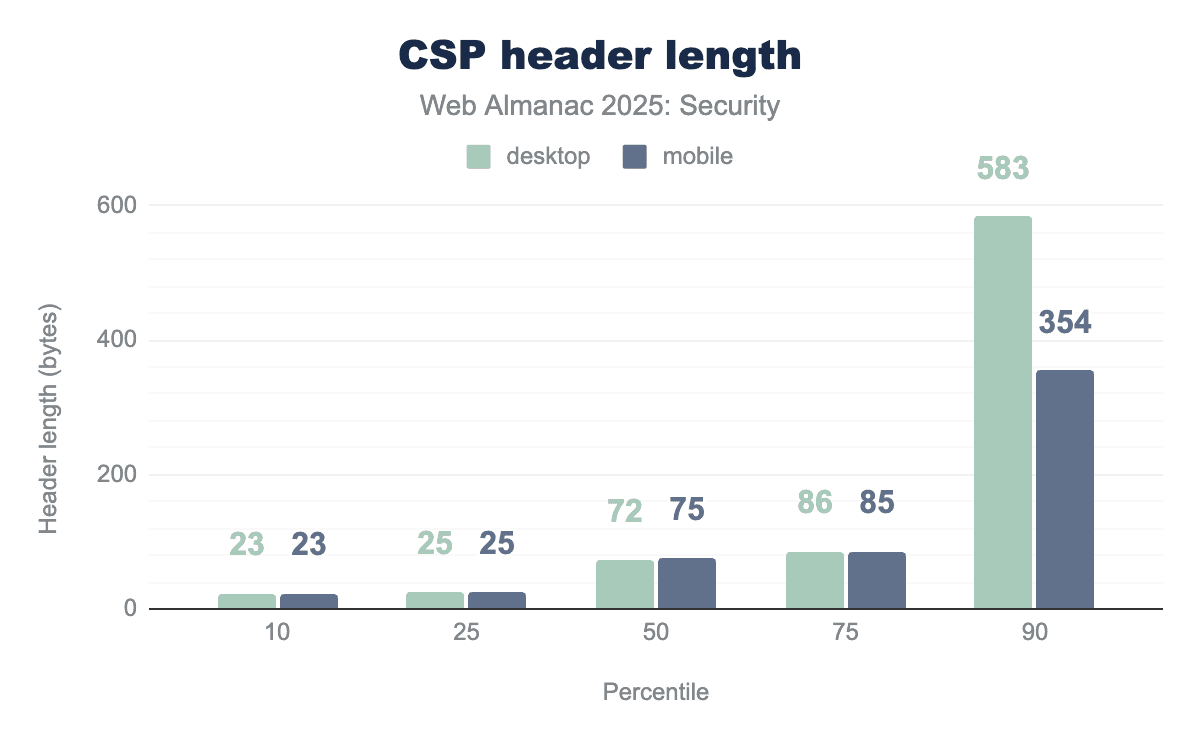 Out of all observed headers, 75% are 86 bytes or less in length. This is slightly more than last year where this was 75 bytes or less. We can see that there are more longer policies in use and in the 90th percentile. The desktop policies have gotten longer while the mobile policies have gotten slightly shorter, increasing the difference between the policy lengths.