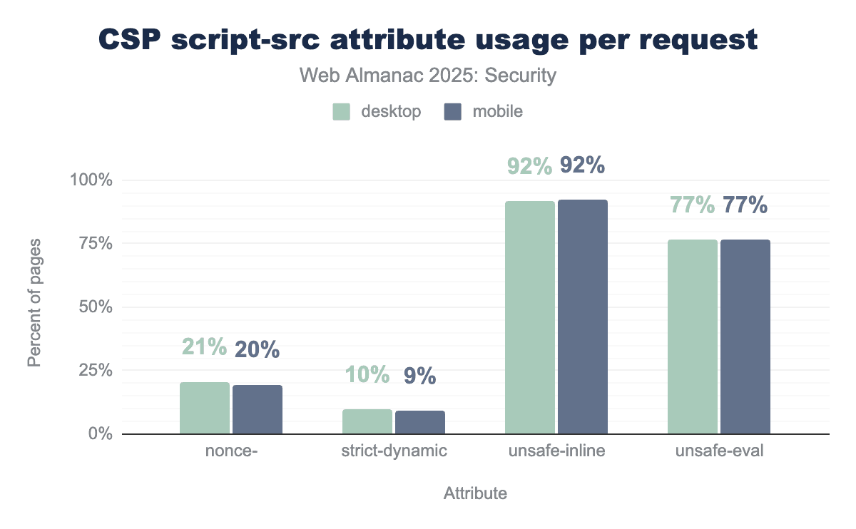 We find that the unsafe-inline and unsafe-eval keywords are used very often. These keywords significantly reduce the security impact of CSP’s script-src as they allow any inline script to be executed or allow the use of the eval-function in JavaScript respectively.