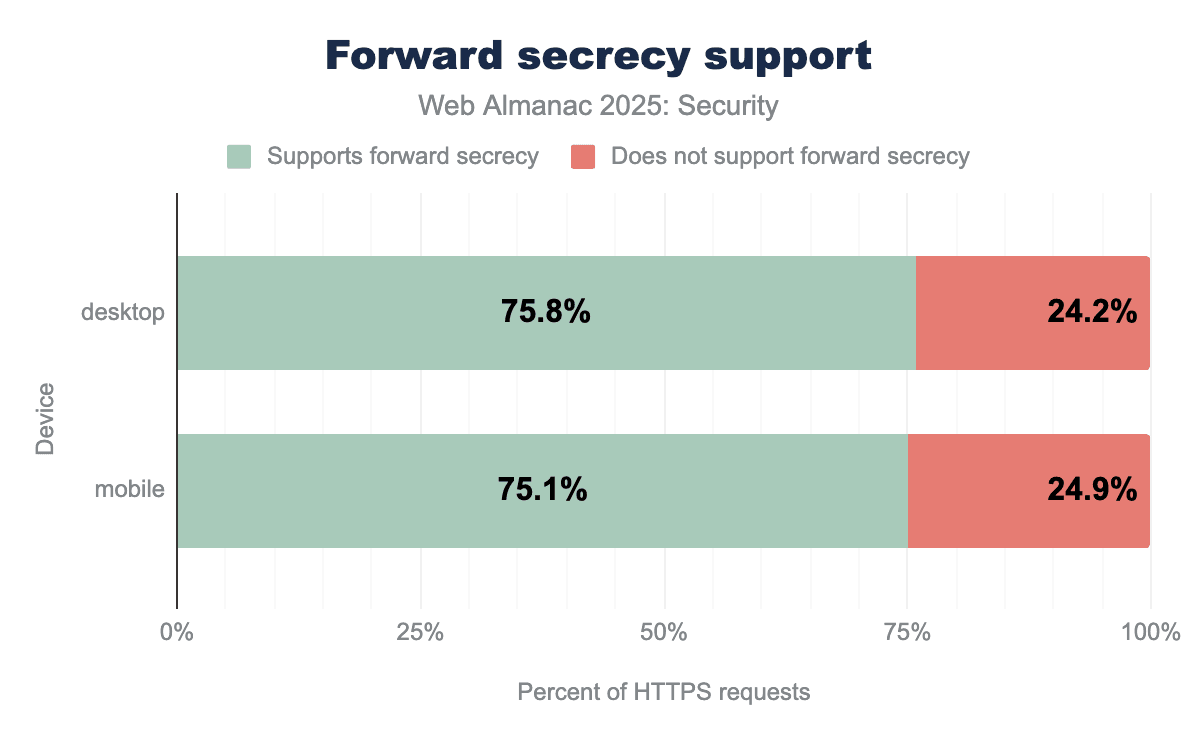 Contrary to our expectations, we see a relatively low number of requests that are sent over connections that are forward secret. There is a 20% decrease in forward secret requests since the 2024 Web Almanac. Currently, it seems our metric only includes the forward secret ciphers in TLS1.2 and TLS1.3, but does not include TLS in QUIC which can explain the decline we observer.