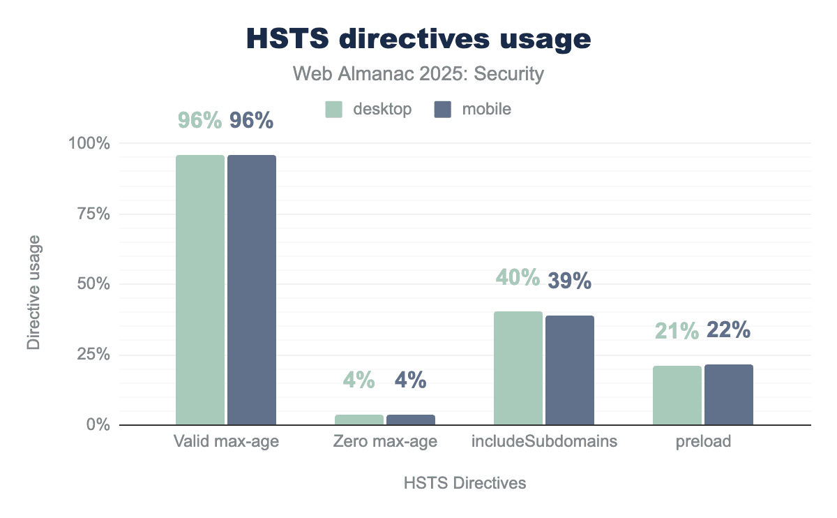 The share of responses with a valid max-age has increased slightly to 96%. The includeSubdomains and preload directives saw an increase of about 4% each, possibly indicating that certain sites started setting both directives together. The unofficial preload directive requires the includeSubdirectories to be set and the max-age to have a value of at least 1 year. When using the preload directive, a site can make sure that a browser will always visit the domain and its subdomains over HTTPS, even when connecting for the first time (which is not necessarily the case when using HSTS without preload).
