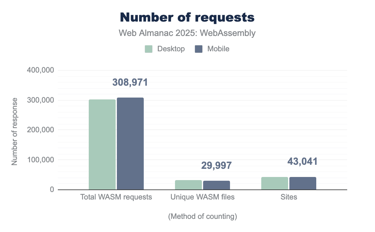 We observed that the MIME type application/wasm is used in 293,470 requests on desktop clients and 301,127 requests on mobile clients.